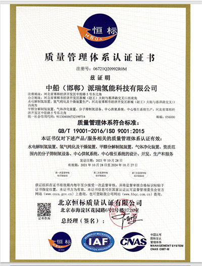 中國船舶重工集團公司第七一八研究所1998年通過GB/T19001質量體系認證,2005年通過中國質量認證中心的CCC認證,2008年通過環境和職業健康安全管理體系認證,實施QEO一體化管理。是世界較大的制氫研究、生產基地。